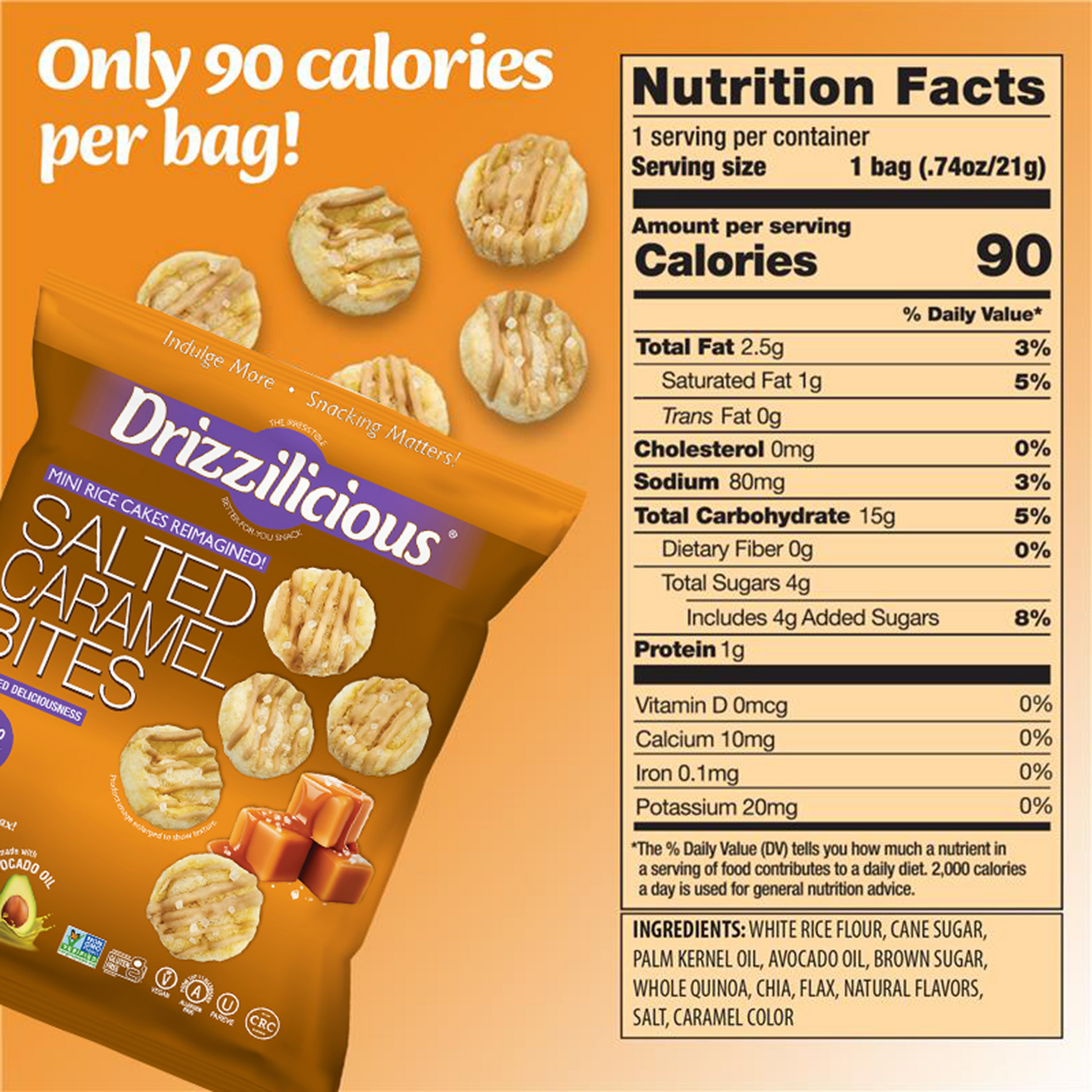 Our Drizzilicious Salted Caramel bites are mini rice cakes reimagined!