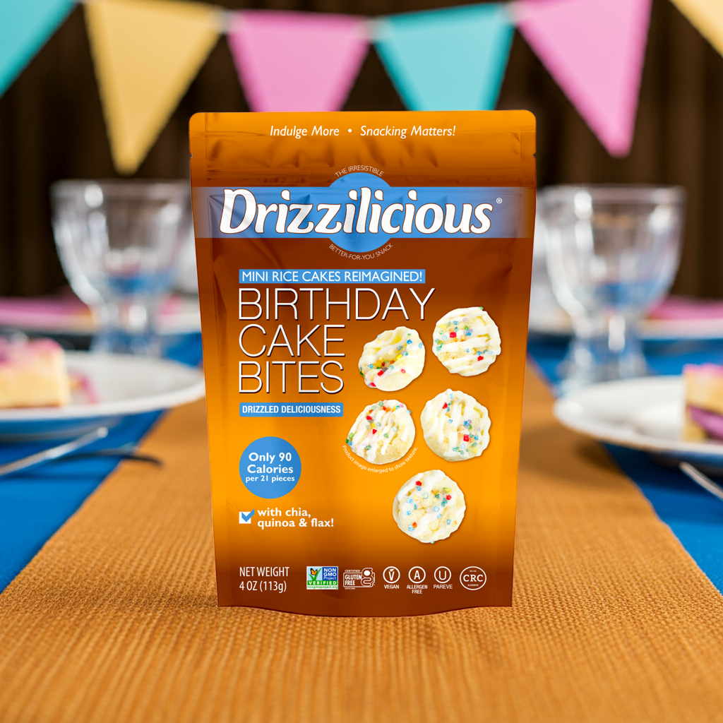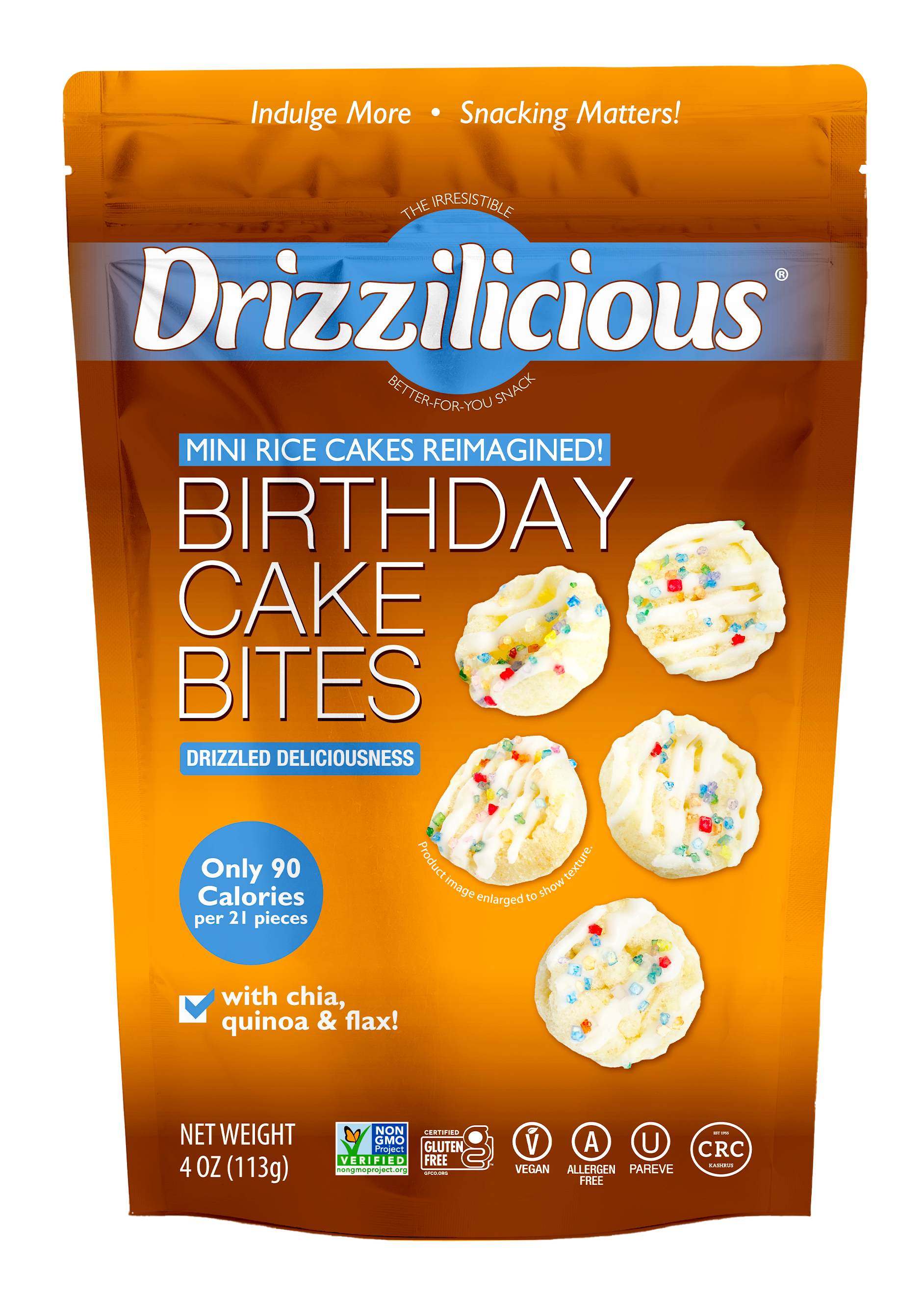 Our Drizzilicious Birthday Cake bites are mini rice cakes reimagined!
