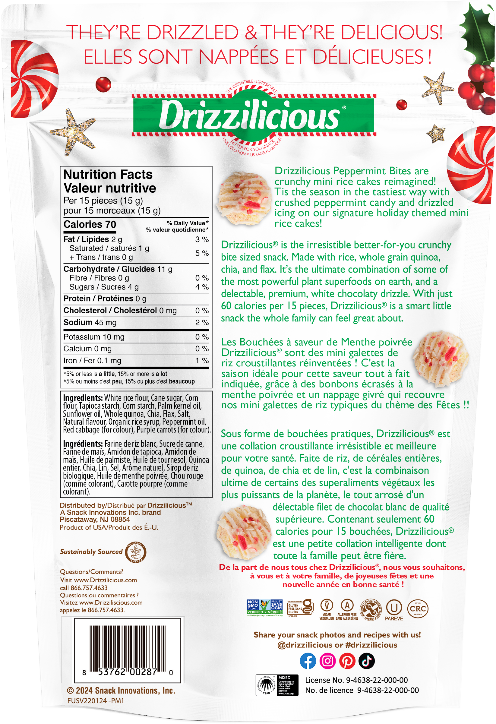 Our Drizzilicious Peppermint bites are the perfect treat to snack on for all—young or old! Cool, refreshing peppermint brings a minty-sweet blast of flavor to our crispy popped mini rice cakes! Finished with a festive drizzle, snacking has never felt so fresh!
